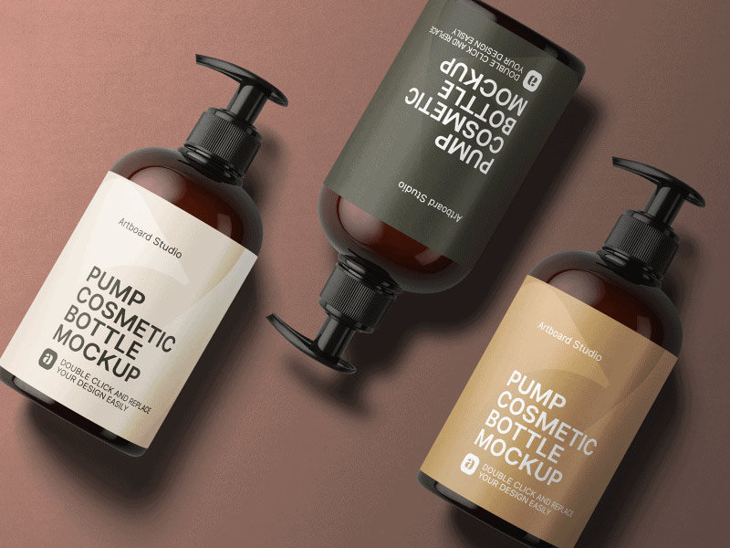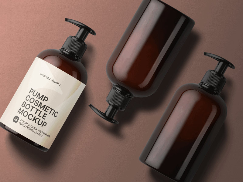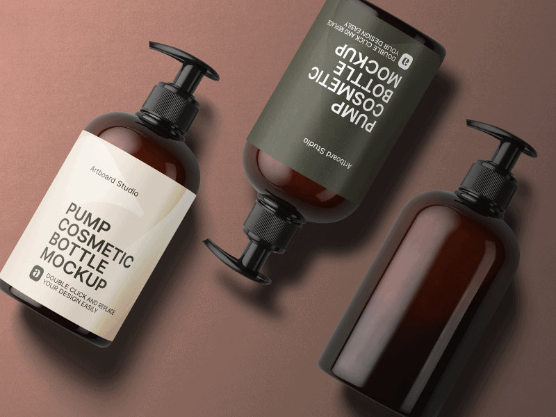 圓形棕色塑料瓶帶壓泵包裝設計,化妝品包材設計,用戶化妝品包裝的泵頭產品,適合做潔面,洗手液,洗發水等產品